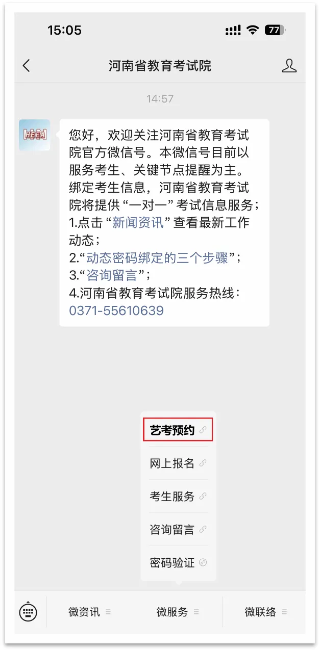 点击“河南省教育考试院”微信公众号菜单,选择【微服务】→【艺考预约】,进入艺考预约的小程序,进行预约操作。预约开始前,考生可以提前完成注册、登录,查看考试流程模拟动画,以便在预约开启时直接进入考试预约环节。